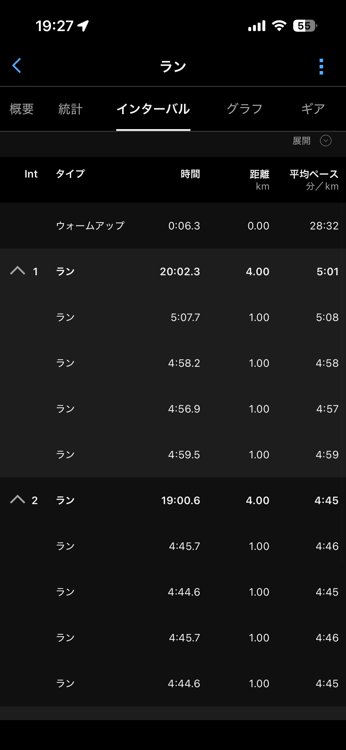 最初の4km、体が軽いのでつい4分50秒くらいで走りたくなります。